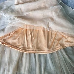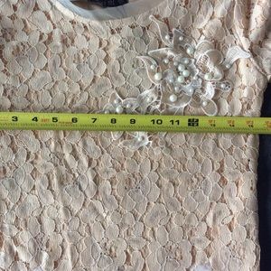 Pretty lace dress with pearl aplique on one side. Three layer flowy bottom (nylon (lined), light netting, topped with chiffon layer). Waistline has harlequin points. 3/4 sleeves. Side zipper. Knee length. Size XL fits more like a med. Runs small. Has a little stretch. Perfect cocktail dress or any occasion. NWT