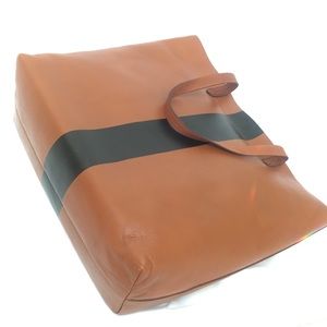NWT Madewell classic cognac leather transport tote with black stripe detail. Don't miss this new take on the gorgeous fan favorite bag that lasts forever and holds everything. Interior wall pocket, open top. 14 ½"W x 14"H x 6"D; 8" strap drop.