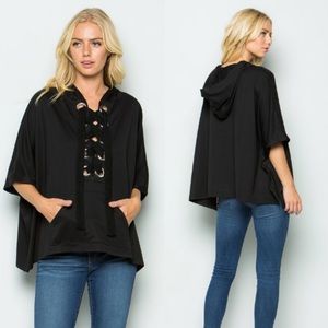 Lace-up short sleeve hoodie in black. Extremely comfortable. Oversized. 100% Polyester. *Modeling size Small*