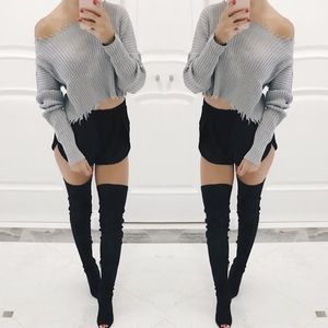 Cropped sweater with distressed detail on top and bottom hem. Relatively thick material and very comfortable. 70% Rayon, 30% Nylon. *Modeling size Small*