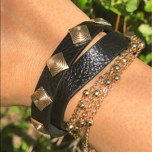 7" black leather fashion wrap bracelet with gold tone swirl design beads and five strands of gold tone beaded chain. The leather band is 10mm wide. The bracelet has a snap closure. Fashion jewelry contains base metal.