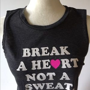 New. Sleeveless Hi-Lo Muscle Tee. Tag says the color is black but it looks like dark gray to me. Dark gray with white letters and a pink heart. Reads Break A Heart Not A Sweat. Crew neck, sleeveless, curved hi-lo hem. Approximately 24" shortest length, 28" longest length. About 17.5" from armpit to armpit. Size Small. 60% cotton, 40% polyester. M12