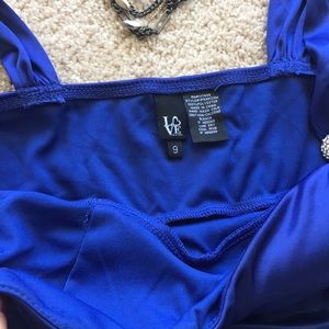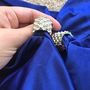 OMG this dress is amazing. If there is one dress to wear for New Year's, going on a hot date or to make your ex jealous this dress IS IT. Super silky and flattering ruching down front and back this dress is a stunning cornflower blue. Has pretty crystal studs at chest with a padded sweetheart neckline and thick to thin straps that you can wear over your shoulder or down the side of your shoulder. Fully lined w/ long side zip. One small pill on chest and barely noticeable tarnishing on metalwork