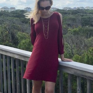 Maroon swing dress, perfect as the weather cools! Rounded neckline, 3/4 length split sleeves, and side seam pockets!! Soft and comfortable. 96% rayon, 4% spandex. Machine wash. Made in USA.