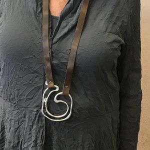 Long leather & silver statement bohemian necklace. A gorgeous matte finish silver tone maze chunks pendent with a stolid gray leather strap. This will make a great addition to any outfit. I also have it in gold, will list on other listing.