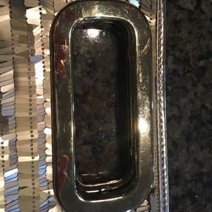 Fun and striking evening bag for going out or Special Occasion. It is gold colored with "fringe" adorning not sides. Gold oval handle hardware is bright gold but does show some scratches. Interior is gold satin fabric and is very clean. Characterized as very good pre-owned condition. Measures 10.5" in length and 6.5" in height