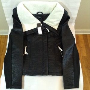 Cute shearling leather jacket size XL or 12-14. Has an eye-catching, shearling collar, metal zip front pockets and long sleeves with ribbed detailing underneath. You'll be living in this all season long!