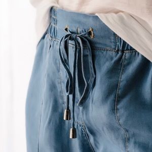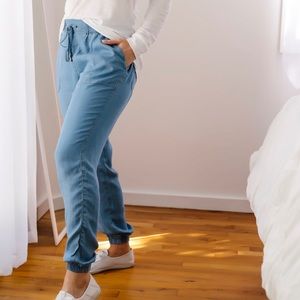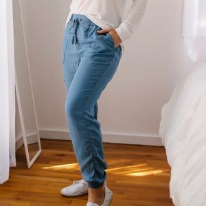 Last one! Only L left! S M is sold out and not being restocked◽️I love these. Chic chambray joggers in the softest material: 100% tencel which is very high quality. Adjustable drawstring waist, 2 front and back pockets, 1 side zip pocket, nonsheer, light blue color that styles beautifully with white basics. A comfortable and practical piece that is great for running errands and for everyday wear in general. Stylish alternative to sweatpants or leggings. Highly recommend!