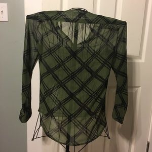 Sheer hunter green & black patterned top, with split neck and buttons. Curved hem. Excellent condition, no flaws. Fabric tag has been removed to prevent it showing through, but I'm pretty sure this is polyester?