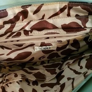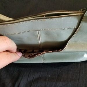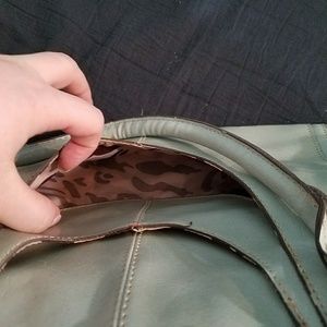 A sturdy over the shoulder bag. Not real leather but feels stiff. Brand New. The plastic is still on the tags. I bought it and never ended up using it. Grey/green color.