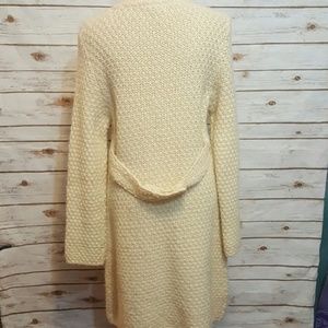 Sleeping on Snow long wool cream colored cardigan with shell buttons and sequin embellishments along button line, collar, cuffs, and waist belt on back. Some natural pilling. Oversized long sleeves. Perfect for snow queens.