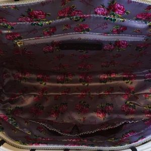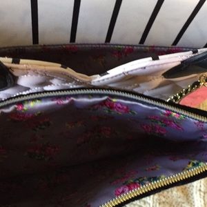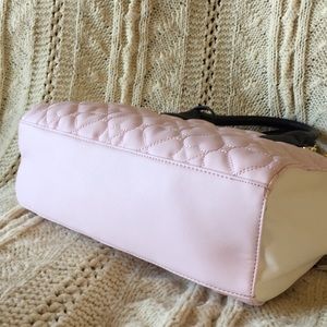 Super cute set! Betsey Johnson blush heart quilted, black and white stripped dip satchel w/ black velvet rose pouch and kitty cat charm. Purse measures 13"Lx11"Hx5"W and removable adjustable strap. Pouch measures 10"x8". NWT!!!