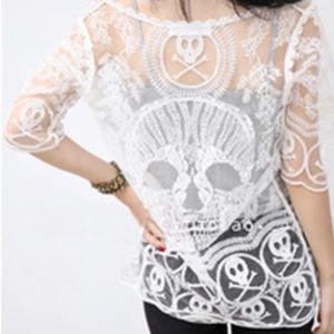 Really pretty NWT lace Skull top. 3/4 sleeves. Soft poly chiffon blend. Perfect for the Halloween season, biker or pirate theme, or really cute for any day! Also makes a sexy beach coverup top. Wear a cami or swimsuit under. One Size Fits sizes M, L, and XL: Bust 39", with stretch to 44". Color is a lovely creamy white. We ship fast with a FREE NWT gift. . Be sure to check out our current listings for bundle discounts! (T8 I4)