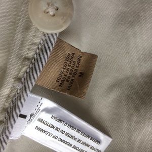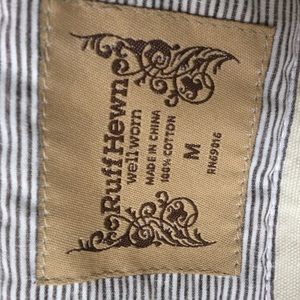 Khaki jacket by Ruff Hewn. Women's size medium. 4 button closure. Working pockets. Elbows have patch detail. Button on the cuff. All measurements are taken laying flat.