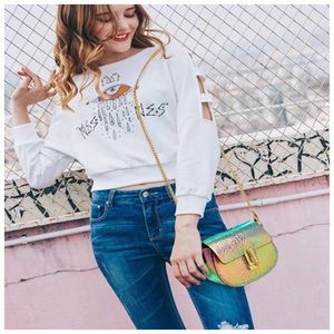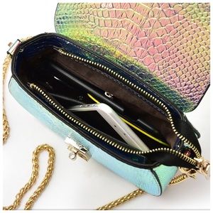 I LOVE THIS BAG!!!! Just the perfect accent to add so much flare! Embossed vegan leather. You are sure to get tons of compliments on this bag. Bag measures 6" high by 7" long. Metal shoulder strap is detachable. Please check my closet for many more items including designer clothing, jewelry, scarves, shoes & much more!
