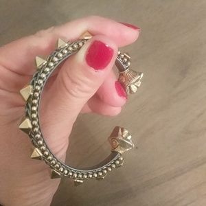Super chic with a rock and roll edge. This bracelet is a heavy weight with edgy studs around and lions on either end. There are certainly some signs of wear. Two of the studs are loose, but they were that way when I purchased it several years ago. Neither stud seems as though it will come off. The bangle is a charcoal color metal and the studs and lions are a gold tone.