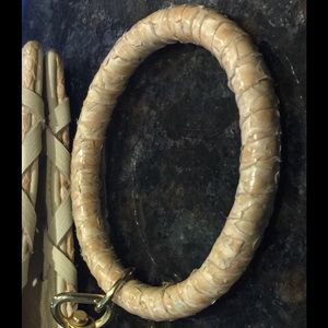 Authentic Ted Rossi Python Leather Clutch Wristlet. Woven with leather trim. Gold-tone studs along the front edges. Circular woven leather wristlet handle that is removable with a lobster clasp. Flap front with two hidden snap closures. Large and small interior pockets. Length 11" inches. Height 5" inches. Height with Handle 8" inches. This gorgeous clutch has never been used. Time to find it a new home. Comes from a smoke-free home. Sorry, no trades. Offers welcome.