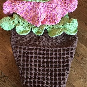 Hand Knitted Large Double Scoop Ice Cream Sleeping Bag/Blanket. Super soft & Warm. Perfect for sitting of couch & slipping legs into cone! Measures 47"Lx26"W Perfect Condition