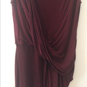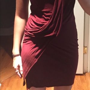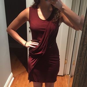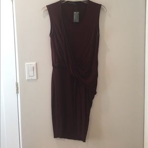 Gorgeous new dress with figure flattering draping on the front. Stretchy 100% viscose. Gorgeous deep burgundy color for fall. Perfect with over the knee boots or ankle booties and a leather jacket.