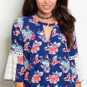 Navy Floral Bell Crochet Sleeve Tunic Dress