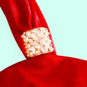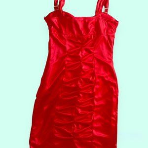 Beautiful silky cherry red satin fabric, padded bust, ruched in front and back, sparkly rhinestone accents on straps, zipper in back