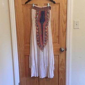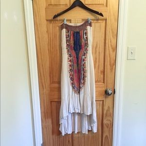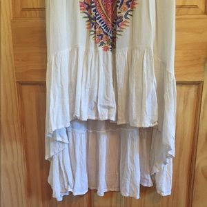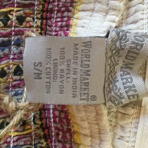 NWT bohemian smocked high-low dress from world market size S/M. The pattern is slightly misaligned on the front (see picture 4), and has a slight discoloration (pic 8) but it's barely noticeable. Very comfy and cute! Perfect for a festival, or even a hippie 70s Halloween costume!