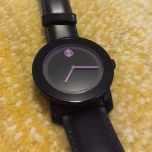 Movado Women's Bold Black and Purple Watch Excellent Used Condition. Purchased approximately three years ago and truly worn only a few times. No visible scratches on face or back. Case is in perfect shape. Original battery (still works perfectly but I'm not sure what the lifespan is). Case measures 36mm (1.41") wide, leather strap measures 17.8mm (0.7") wide. Signature dot at 12:00. Quartz movement. Water resistant tested at 50M. Questions? Please ask.
