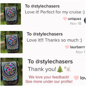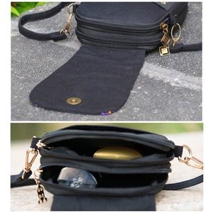 This (Photos 1-4) is an intricately detailed embroidered very special and unique little purse. The floral, butterfly and parrot artwork is exquisite and difficult to portray in photos. Purse is black canvas. 6" wide. 8.5" tall. Snap and dual zipper closures to 2 main compartments and an open front phone pocket. Removable strap adjusts up to 50" for use as crossbody, messenger bag or clutch. Little back belt loop for optional belt wear. Brilliant gold hardware. NWT. We typically ship daily! PA F8