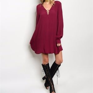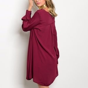 Long sleeved tunic dress-burgundy color-comfortable fit-ring detailed neckline-100% polyester