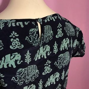 In excellent used condition! Navy background top with great green elephant design pattern. Measures about 17.5 inches from underarm to underarm and about 24 inches from shoulder to hem. Small pocket on the left front side. Eyelet in the back.