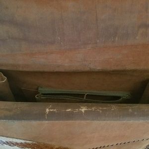 Has some rough spots, one on top (pictured) and strap. However in nice condition considering its delicacy and age. Measures: 10.25" x 8" x 3.35". Strap drop 7.25"