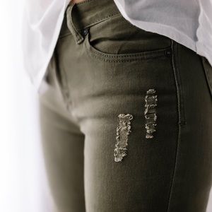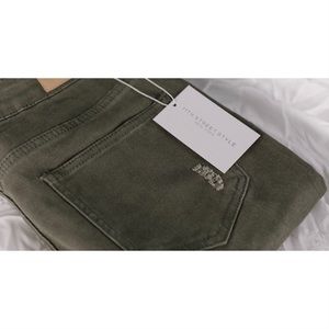 ◽️Loving these jeans! This fatigue olive is the perfect shade 🌻Distressed wash. 98% cotton 2% spandex, stretchy, soft, true denim, completely nonsheer, fabric has a nice weight to it. Well made + premium quality. Wearing with my Paris Top. Price firm.