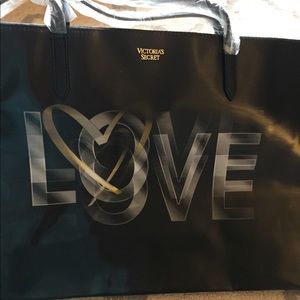 This is a brand new, in package Victoria's Secret Tote and necklace. The tote has LOVE written in holographic on the front and 2 inside slip pockets for a phone and keys. The handles are a good quality faux leather material. Measures 20.5"x12"x6". The necklace is a gold color with a heart pendant. It comes in a little zippered, black satin pouch with LOVE written in pink and a gold heart.