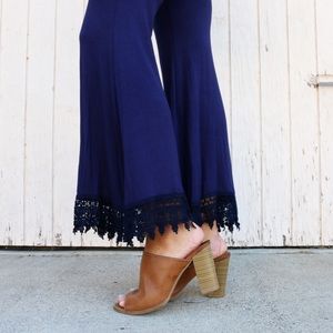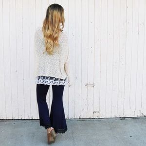 offers welcome navy flared pants with lace trim hem. elastic waist and feel like leggings. model is wearing a size small. •4567569•