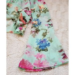 Floral crop top that is 3/4 sleeve. Shirt is a mint color. Shirt is somewhat see through. Made in USA with imported materials. 100% polyester.