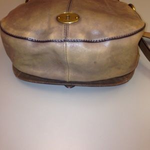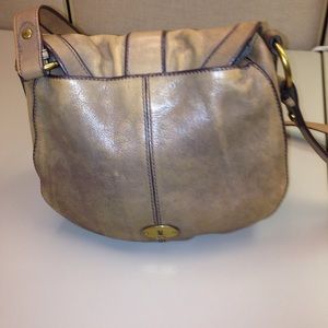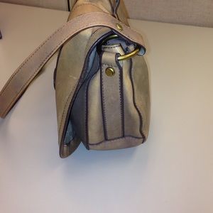 Taupe/budge distressed leather. Magnetic fold over closure. Gold tone hardware. Exterior snap pocket. 23' adjustable strap. Zip & slip pockets inside clean interior. Tiny spots on bottom of bag. Very nice & stylish