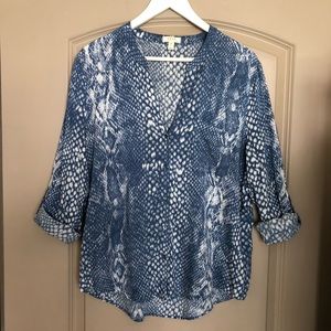 Allover snakeskin print, exposed button front placket