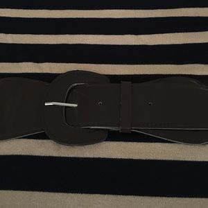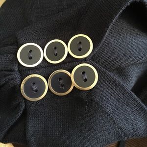 NWOT. Never worn sweater dress. Color is actually navy blue with beige stripes, brown belt and button details on shoulders. Belt included.