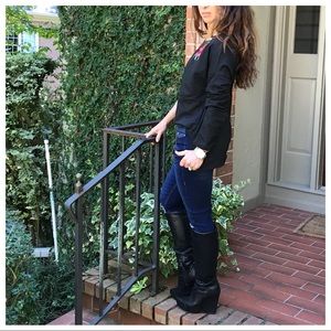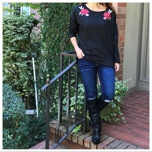 From my buying trip in Paris gorgeous terry black cut out neck with flowers appliqué tunic this is a light poly French terry one size loose fit has small side slits bust measurements laying flat on one side 22 length 27
