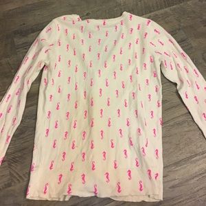 Preppy Merona Sea Horse Cardigan. Size medium. Preloved with lots of life left! Does show some balling/pilling but mainly in the Under arm area. Cream with neon pink sea horses. 3/4 sleeves and V-neck. Tons of ways to style this adorable cardigan! A definite must have (especially for a southern gal!) smoke free and pet free home