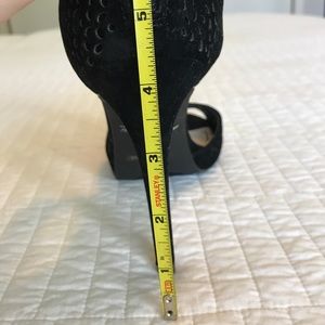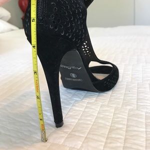 Never worn. Size 8.5 black cutout T-strap 4.5” heel (from heel seam to bottom of tip). Side double buckle and back zipper detail. RIGHT HEEL IS MISSING HEEL TIP. Easily fixed. Great party shoe shoe with skinny jeans or a short dress!