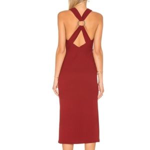 All the Right Angles midi dress in red by Free People. Gorgeous ribbing and bandage construction create intriguing texture on a flattering midi-length dress styled with a diminutive front keyhole and strappy racerback centered with a metallic ring.