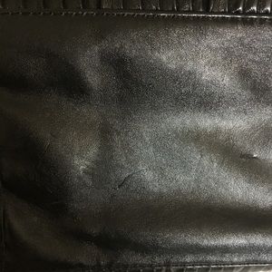 No stains, no holes, all zippers work, there are a few unnoticeable scratches on the bottom and on the hanging key fob (see pics). In excellent preowned condition, like new.