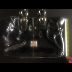 Authentic Dooney & Bourke Glossy Black Leather Bag. Good condition. Ink pen stains inside. Minimal wear to the four exterior corners on the bottom of the bag
