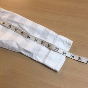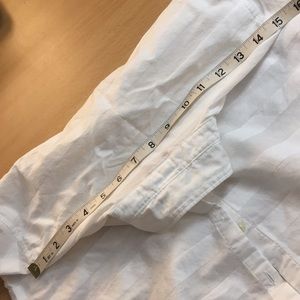 Great looking classic button down shirt. It has a handsome white on white subtle striped texture because of fabric weave. The bottom hem has a slight curve at hip.