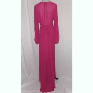 A whimsical dress! Flows gracefully! Low draped v-neckline. Long slit sleeves with a gold button closure. Stretch waist. Attached belt at sides to tie as you wish. Slits down both sides. Extra long length as pictured. Top is sheer so something cute under will work. Lining is short. Goes from waist to around the hips as seen on stock pictures. Pull-over. No zippers. Hand wash. 100% Polyester. Boutique NWOT.