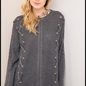 MY FAVORITE SWEATER ‼️. HIGH QUALITY SOFT CABLE KNIT WITH TIES ON THE FRONT & A LIGHT COLOR GOLD HARDWARE. THIS COULD BECOME YOUR NEW FAVORITE TOO💕 FIRM