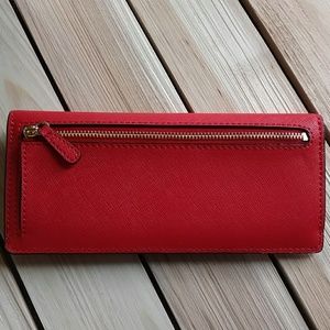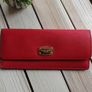 BEAUTIFUL MK WALLET W THE LOOK FOR FALL IN A GREAT BURNT ORANGE RED TONE..THIS WALLET IS GREAT CONDITION NO STAINS OR RIPS..THERE IS A SM HOLE PUNCH FROM SECURITY TAG BEING PUT ON IT..IS ALREADY REFLECTED IN PRICE..TREAT URSELF TO FALL!!!