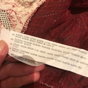 This outfit is so flattering on. Supper snug ( holds it all in) and good stretch fit. High waisted skirt fits to the knee. Cream with maroon and black print. Both pieces USA size small