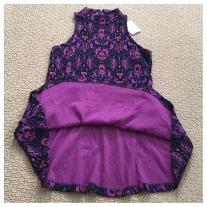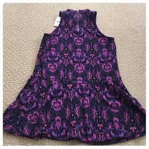 Free People Purple Combo Amelia Mini Dress, 54% cotton, 37% polyester, 6% wool, 3% spandex, machine washable, 19" armpit to armpit (38" all around), 41" dropped waist, 35" length, 9" armhole, cute sleeveless printed dress with retro neckline and effortless drop waist silhouette, stretchy, back zipper closure, measurements are approx. NO TRADES